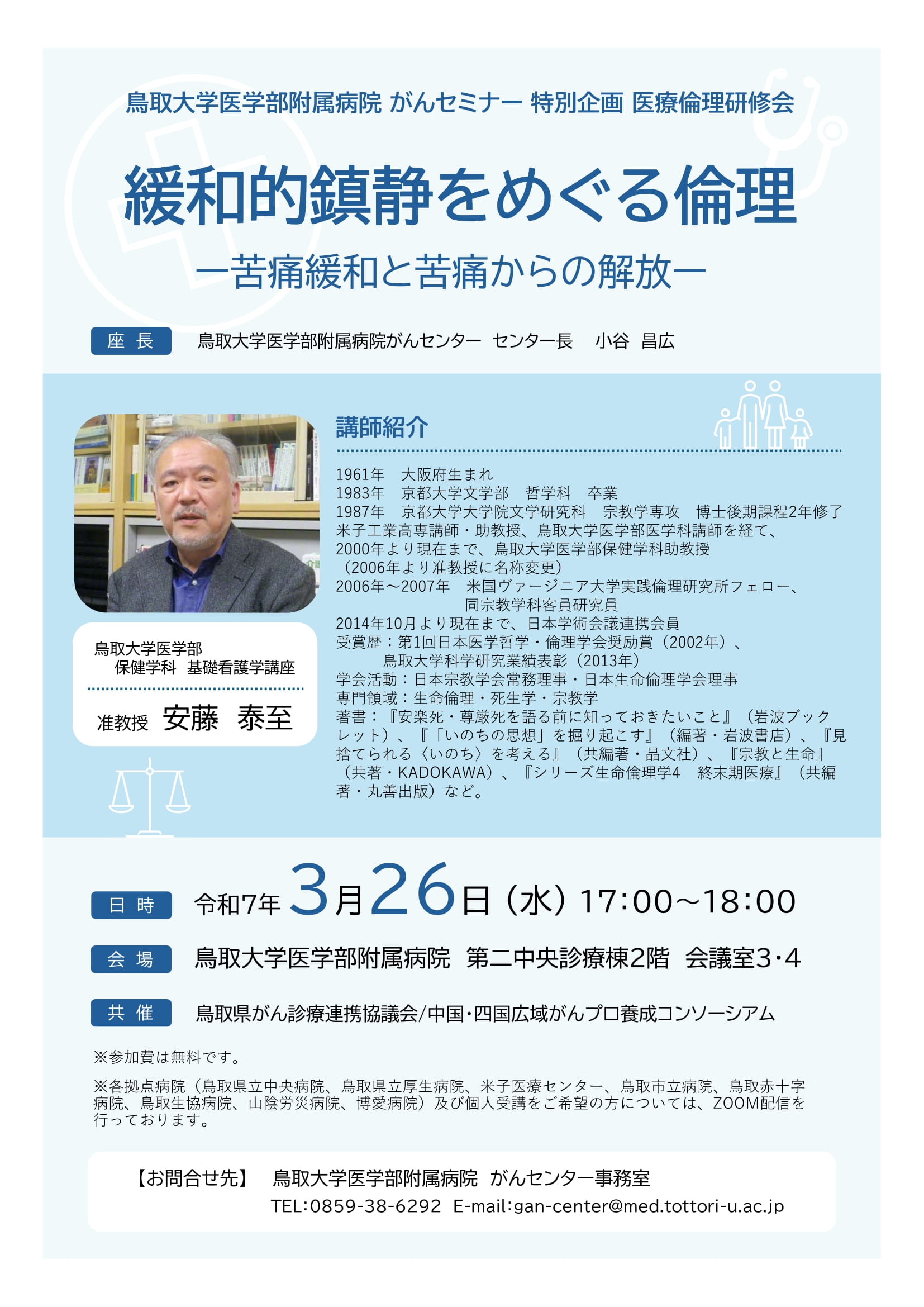 鳥取大学医学部附属病院がんセミナー            「緩和的鎮静をめぐる倫理-苦痛緩和と苦痛からの解放-」